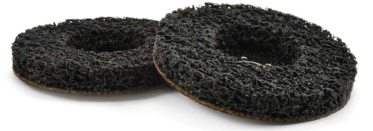 Portable, large diameter flap wheel conforms to right angles to remove or refine inside corner welds, clean or refine narrow channels or extrusions. Quick change hub for use with right angle grinders.